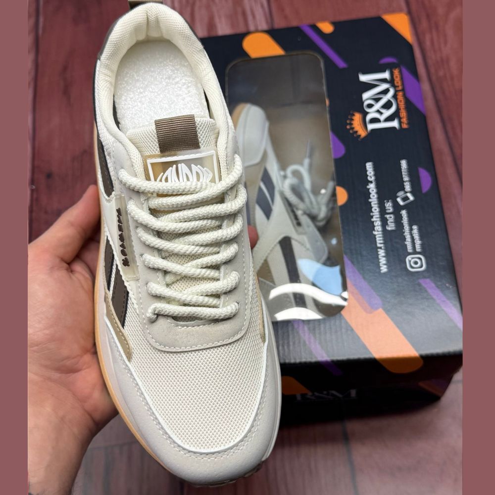RM801 patike su savršen izbor za muškarce koji traže laganu i stilizovanu obuću za svakodnevne aktivnosti. Ovaj model kombinuje nežne krem i bež tonove sa tamnijim braon detaljima, pružajući sofisticiran izgled koji se lako uklapa u „casual“ i sportsku garderobu.
