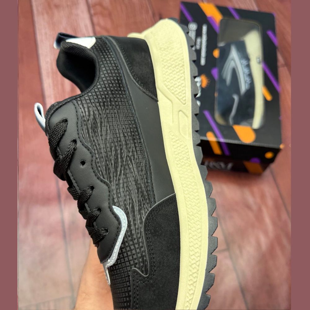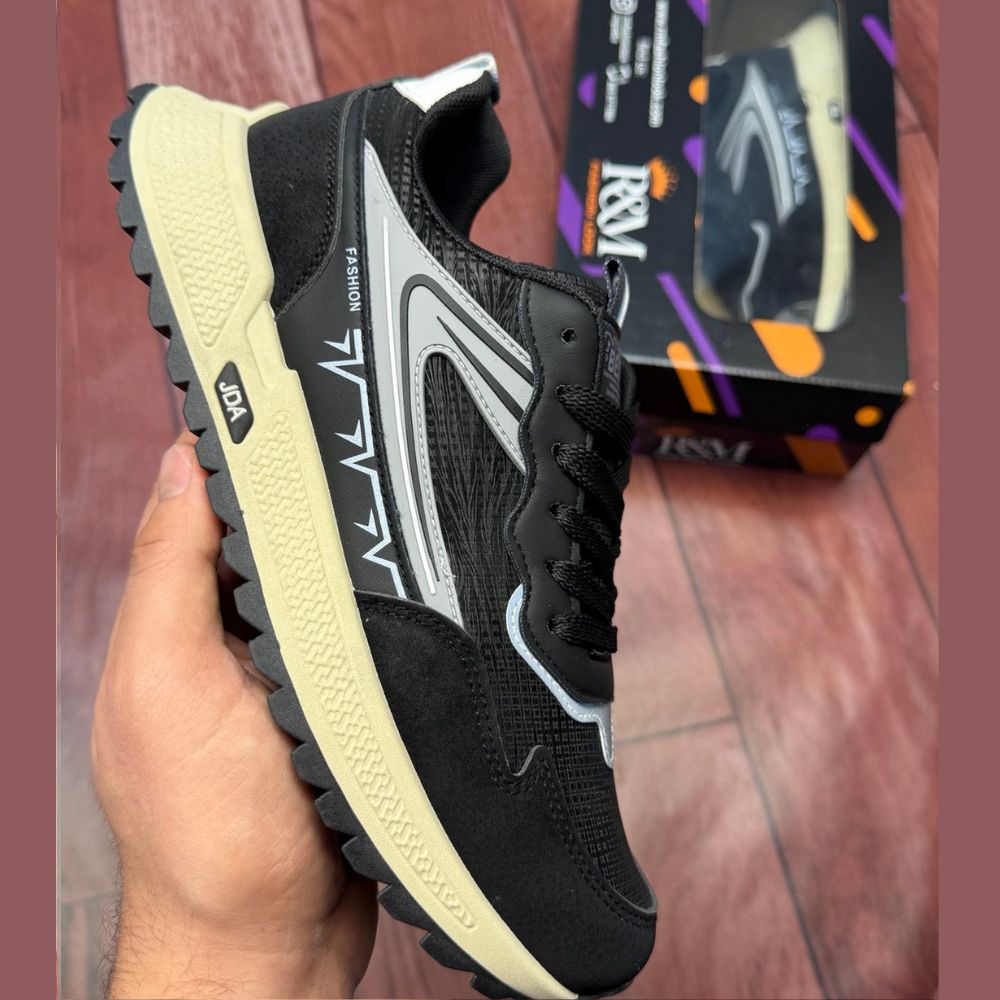 Gornji deo karakteriše specifična tekstura sa mrežastim panelima koji podsećaju na karbonska vlakna, čime se postiže vrhunska izdržljivost i moderan stil. Bočne linije u srebrnoj boji pružaju dinamičan kontrast crnoj osnovi, dok uzvišeni rebrasti đon u krem nijansi nudi superiornu amortizaciju i stabilnost pri svakom koraku.