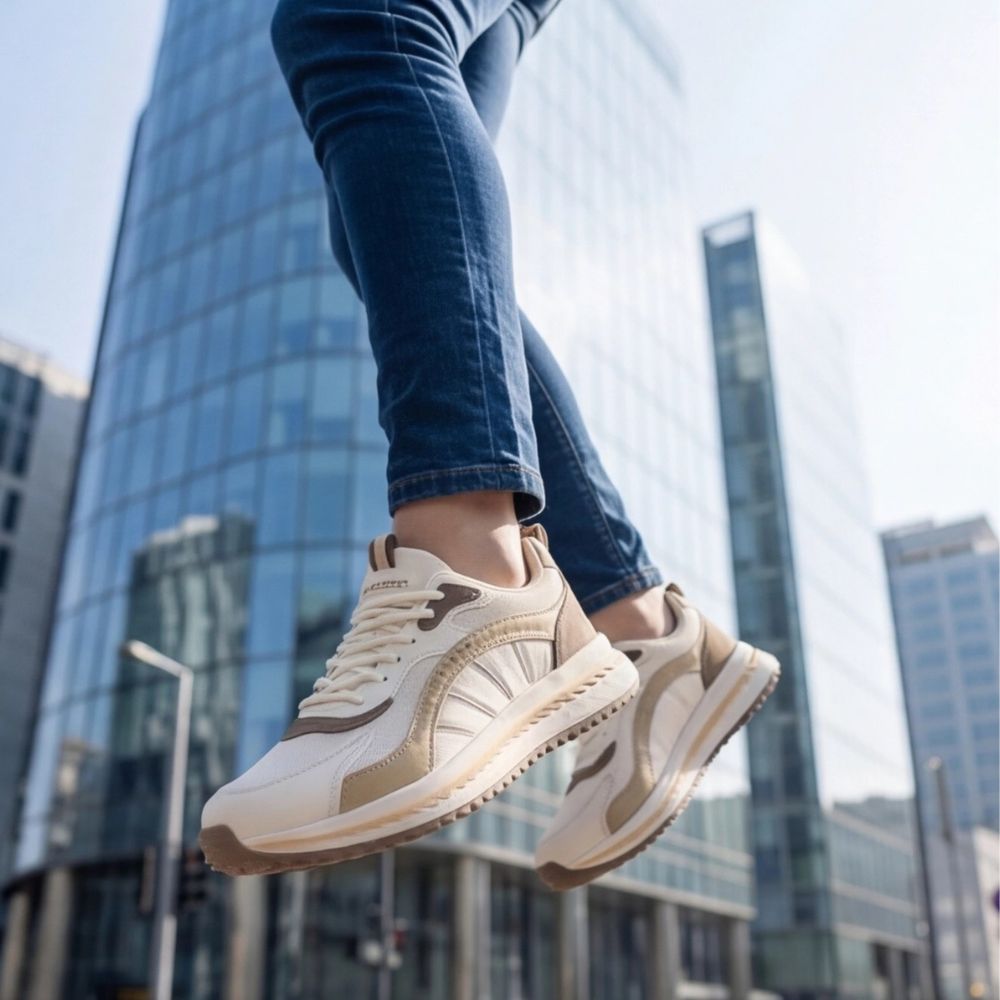 Gornji deo je izrađen od kombinacije prozračne bele mrežice (mesh) i precizno uklopljenih panela od eko kože i prevrnute kože u toplim zemljanim tonovima. Bočni detalji sa natpisom "Fashion" dodaju urbanu notu, dok specifičan rebrasti đon sa nazubljenim profilom ne samo da izgleda atraktivno, već pruža vrhunsku stabilnost i amortizaciju pri svakom koraku.