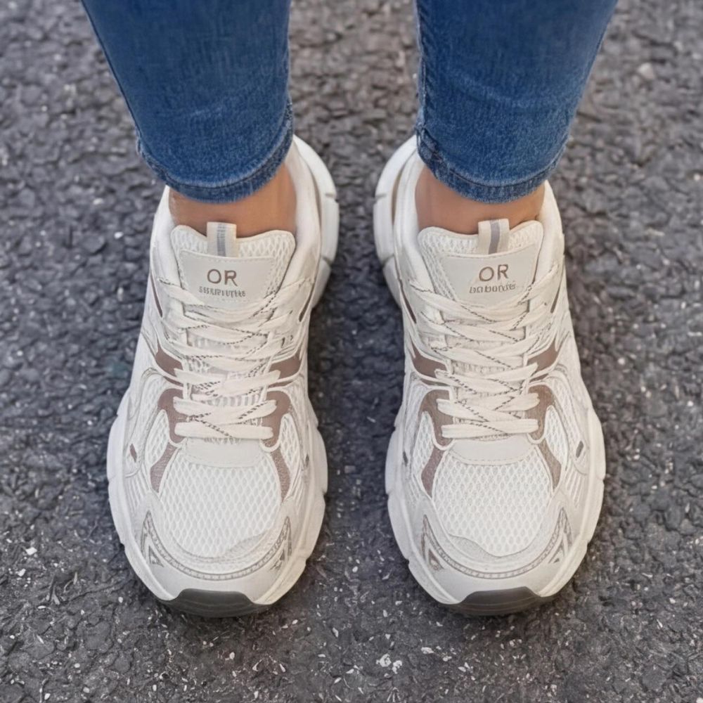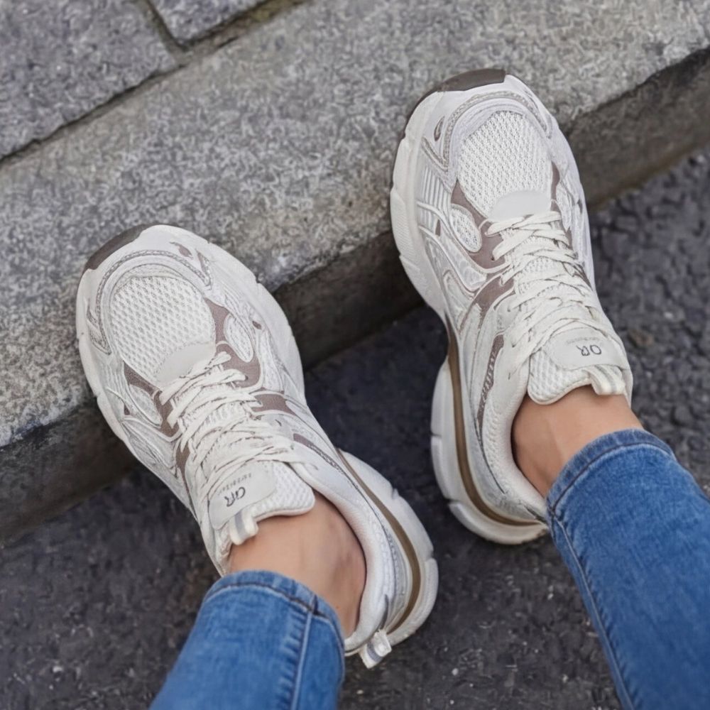 Gornjište je definisano snežno belom mrežastom (mesh) bazom koja osigurava maksimalnu prozračnost, dok paneli u boji peska i bogati braon akcenti na đonu i jeziku dodaju vizuelnu dubinu. Prepoznatljiv "OR FASHION" logotip na jeziku i specifični linijski detalji daju ovom modelu karakterističan futuristički profil.