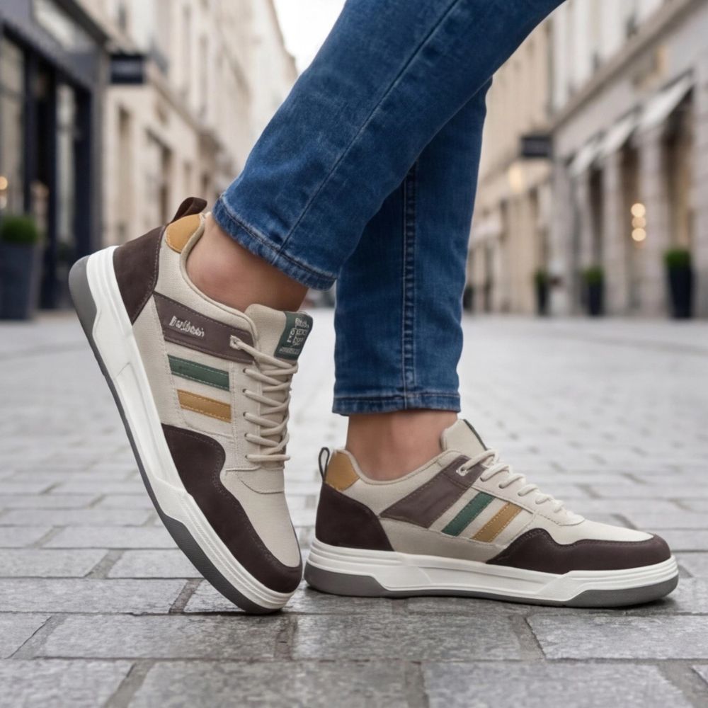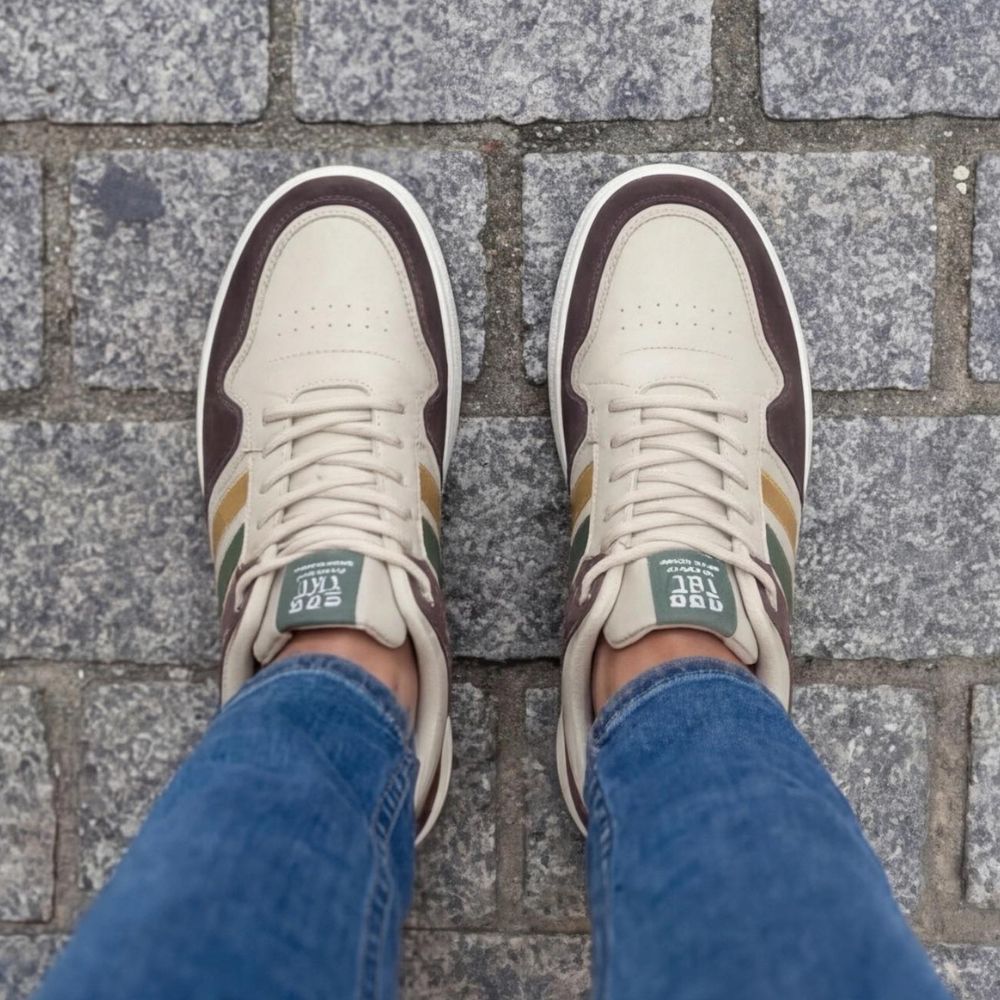 Gornjište kombinuje bazu u boji peska (bež) sa kontrastnim tamnobraon panelima na peti i prstima. Ono što ovaj model čini unikatnim su tri bočne pruge u tri različite boje – tamnozelenoj, maslinastoj i oker-žutoj – koje se savršeno nadovezuju na zeleni detalj na jeziku sa „SAGE FASHION“ logotipom.