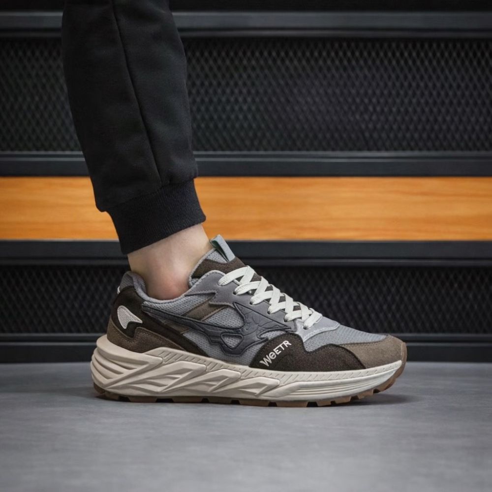 Gornjište karakteriše kompleksna igra slojeva, gde se prepliću siva baza, tamnobraon detalji i hromirani (silver) umetci na prednjem delu. Prepoznatljiv tamnosivi element u obliku munje i beli natpis „WEETR“ na bočnoj strani naglašavaju dinamičan karakter patike, dok đon u kombinaciji bele i „gum“ (boja sirove gume) boje zaokružuje ovaj retro-futuristički izgled.