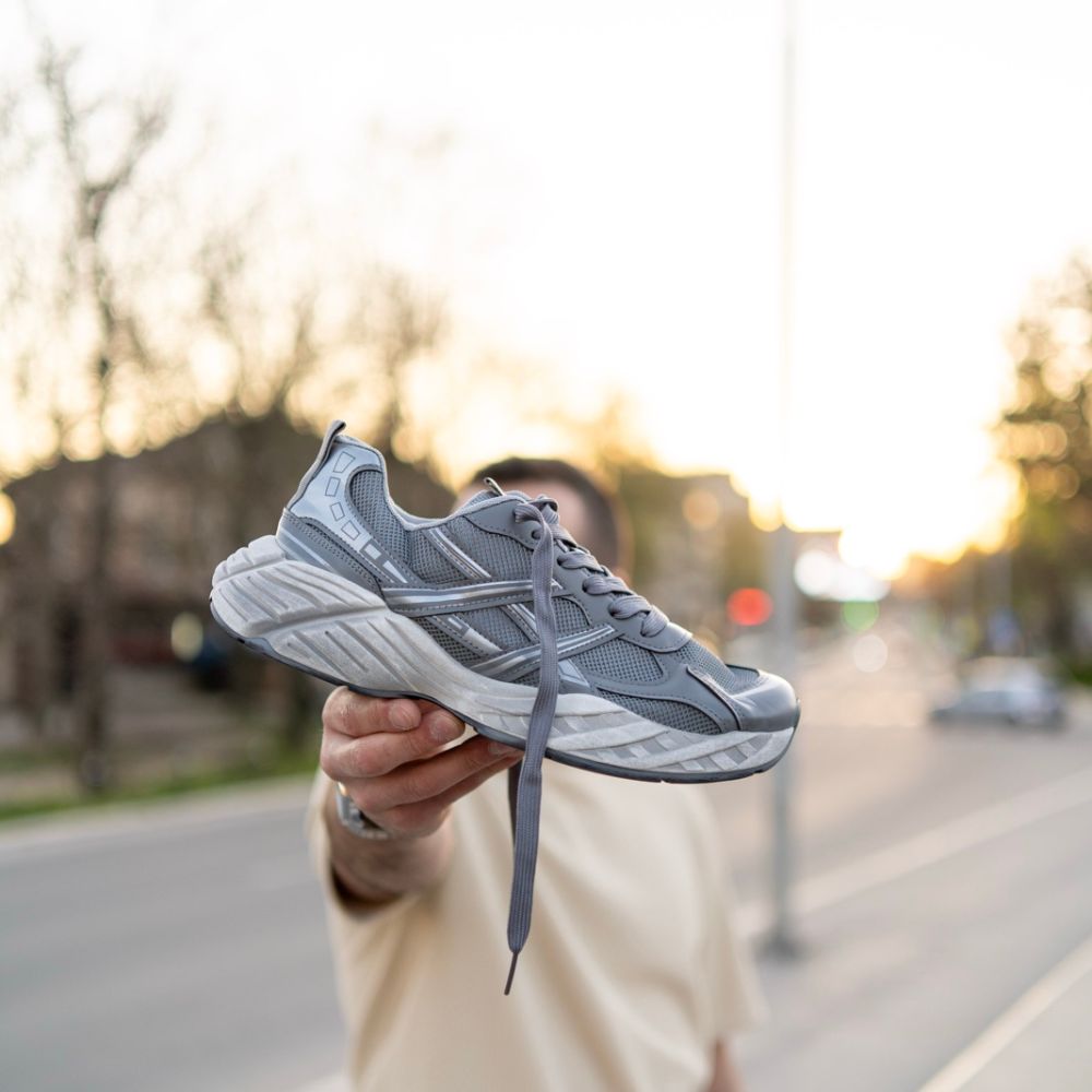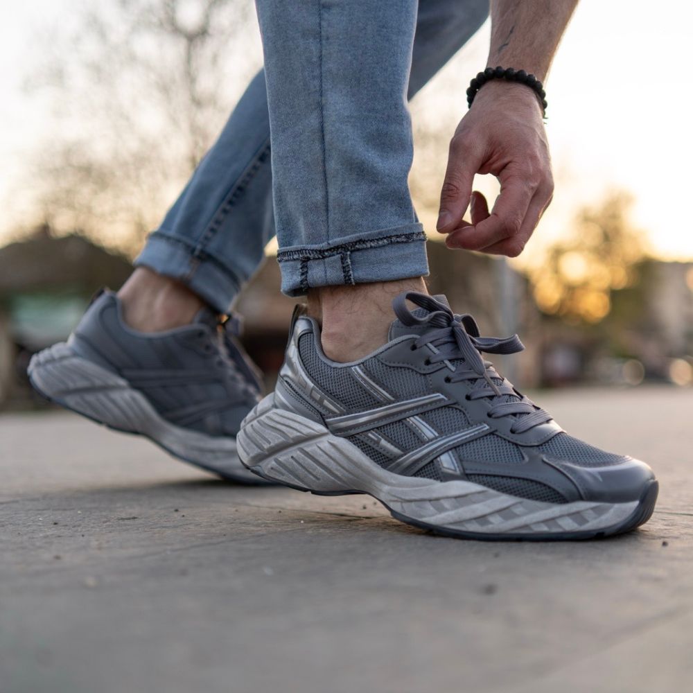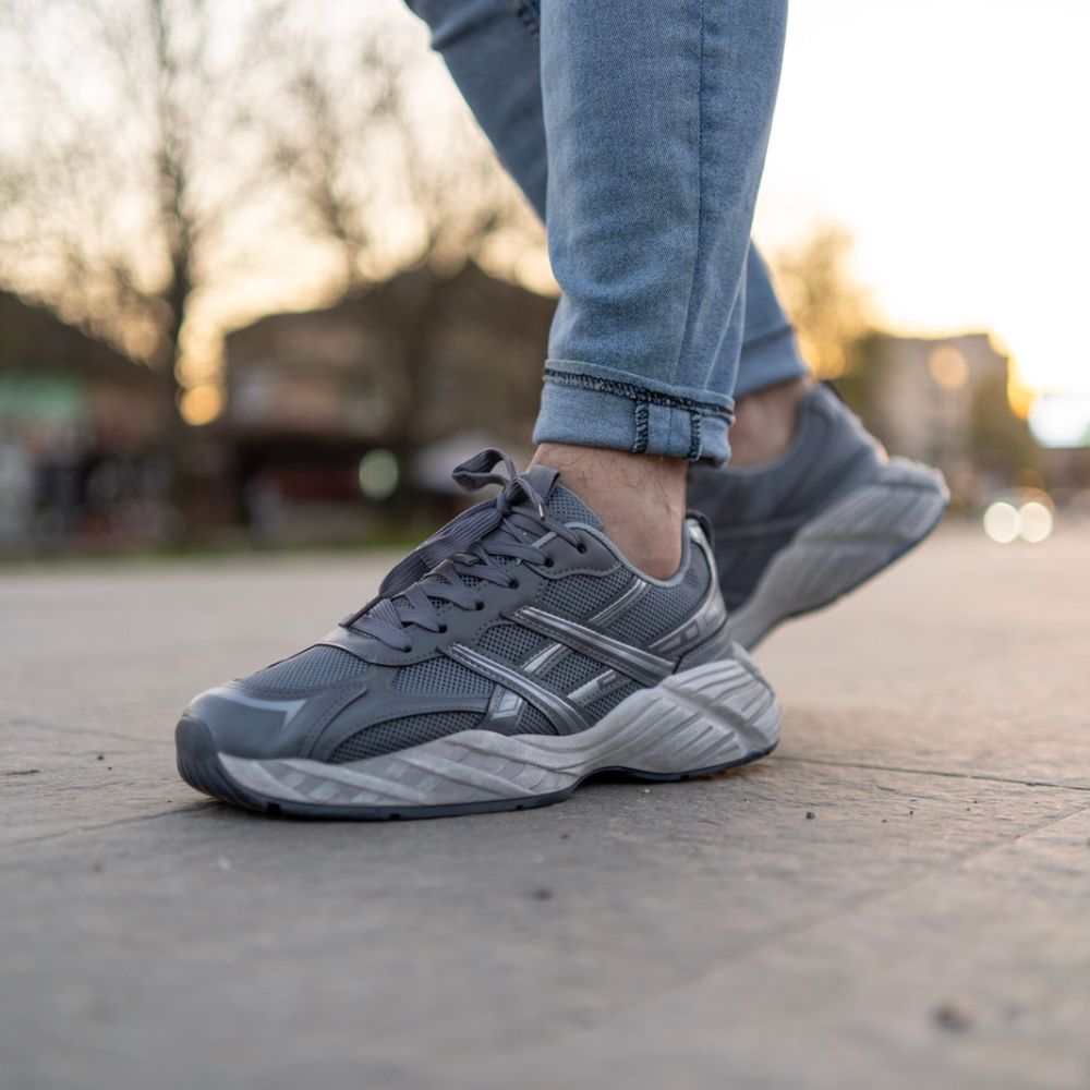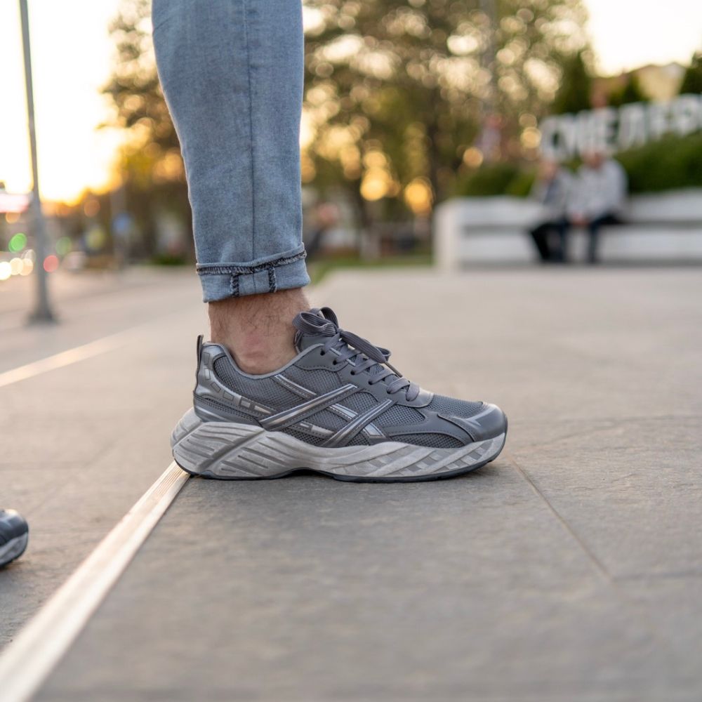 Gornjište je izrađeno u kombinaciji guste tekstilne mrežice (mesh) i ojačanja od eko-kože u tamnosivoj nijansi. Poseban vizuelni pečat daju srebrne (metallic) linije na bočnim stranama koje se presijavaju, pružajući modelu dinamičan profil. Masivan, skulpturalni đon u svetlijoj sivoj boji sa specifičnom teksturom osigurava prepoznatljivu siluetu ove serije.