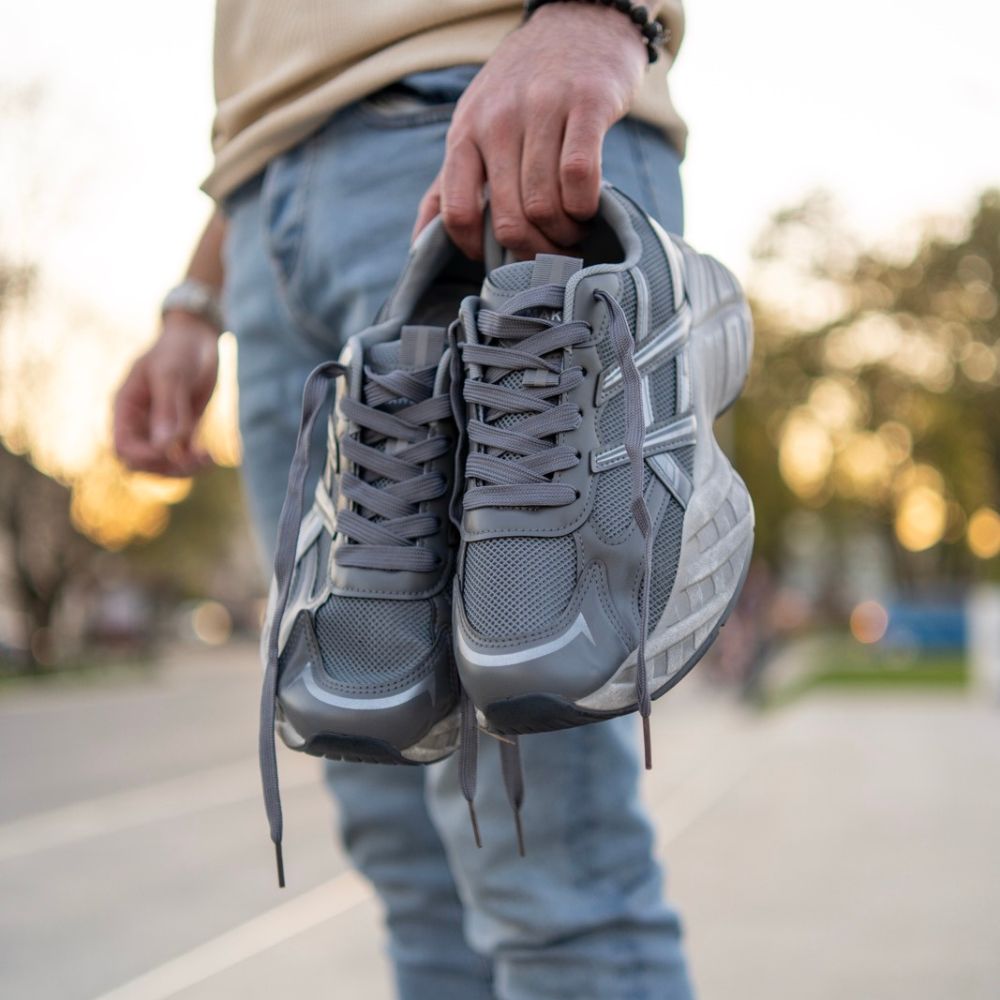 ✔ Boja: Dominantna siva u više nijansi sa metalik srebrnim akcentima. ✔ Zatvaranje: Klasične sive pertle koje doprinose kompaktnom i monohromatskom izgledu. ✔ Materijal: Prozračna mrežica za optimalnu ventilaciju u kombinaciji sa slojevima sintetičke kože. ✔ Đon: Ekstra masivan i profilisan sivi đon sa reljefnim šarama za vrhunsku stabilnost. ✔ Detalji: „MAKR FIAWLEHA“ natpis na jeziku i reflektujući elementi na prstima za moderan završni dodir.