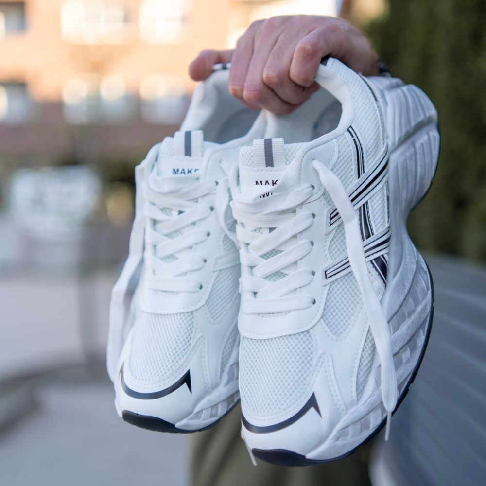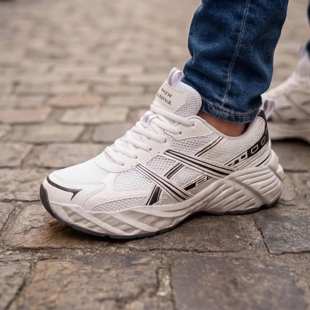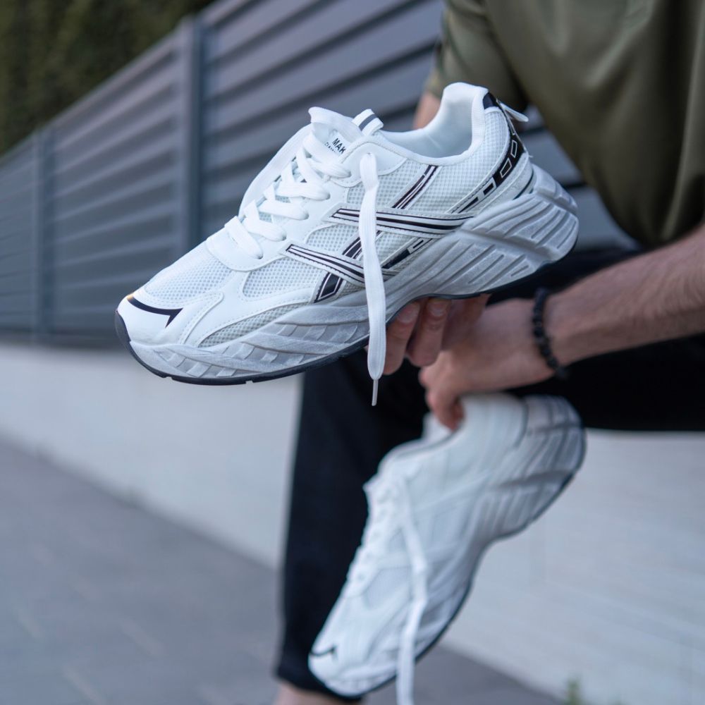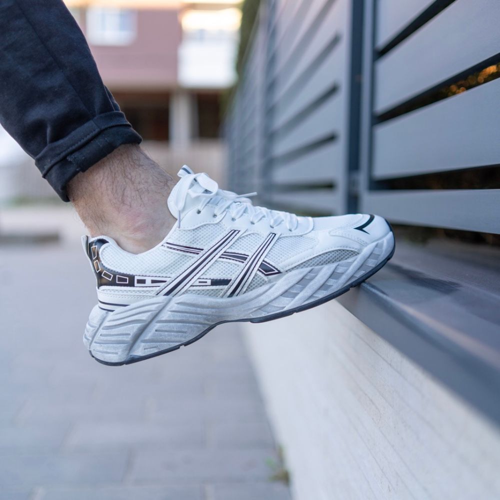 ✔ Boja: Dominantna snežno bela sa crnim grafičkim linijama i metalik srebrnim detaljima. ✔ Zatvaranje: Klasične bele pertle koje se savršeno uklapaju u čistu estetiku modela. ✔ Materijal: Kombinacija lagane, guste mrežice za vrhunsku ventilaciju i sintetičkih ojačanja. ✔ Đon: Masivan, reljefni sivi đon sa unikatnom teksturom koja pruža stabilnost i modernu amortizaciju. ✔ Detalji: „MAKR FIAWLEHA“ brending na jeziku i upečatljiv crni „V“ element na prednjem delu.
