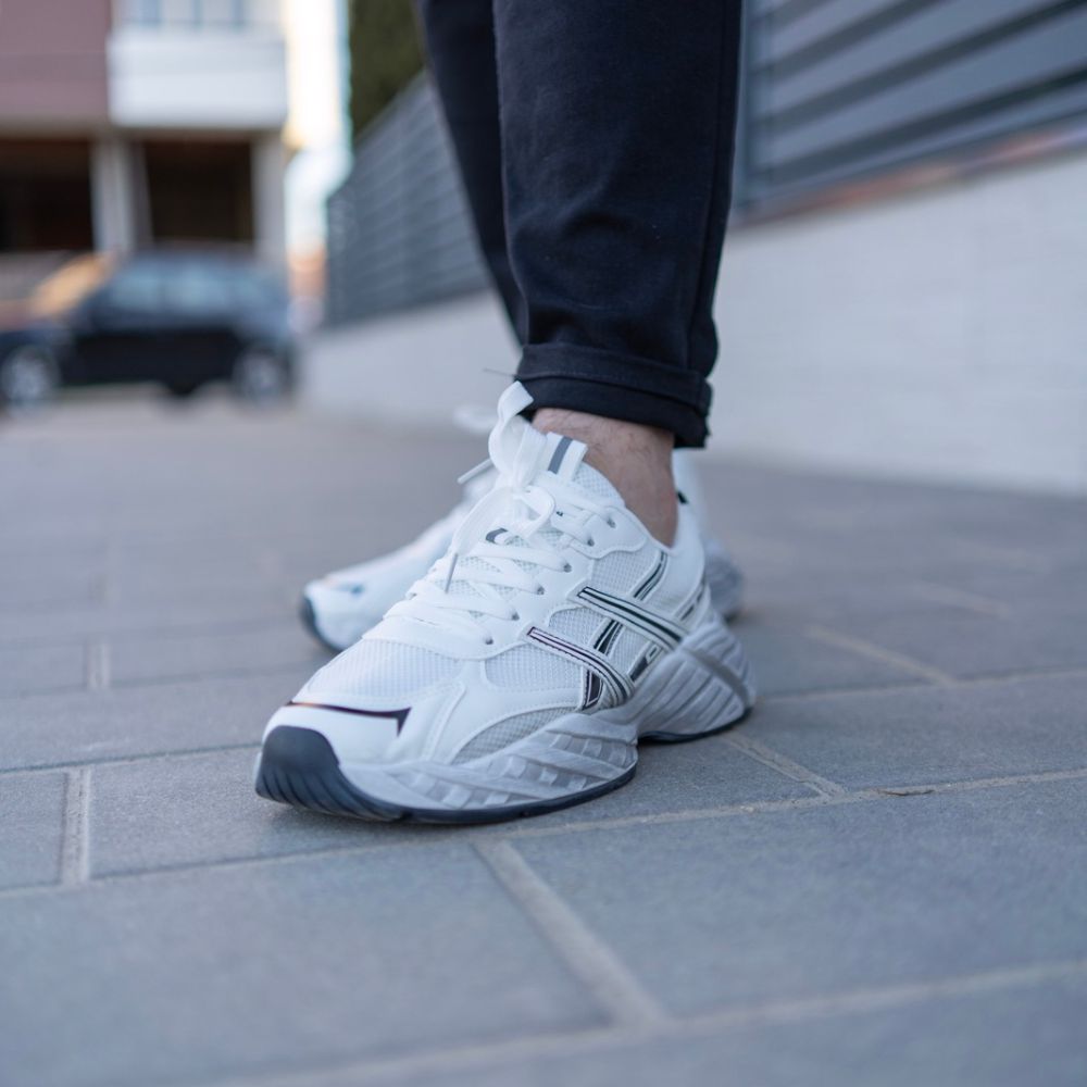 Gornjište dominira snežno belom bojom, gde se prepliću slojevi prozračne mrežice i ojačanja od eko-kože. Dinamične crne linije na bočnim stranama pružaju oštar kontrast i naglašavaju brzinu siluete, dok srebrni (chrome) detalji na prstima i jeziku daju modelu luksuzan, tehnološki prizvuk. Skulpturalni sivi đon sa efektom brušenog metala pruža savršen vizuelni balans belom gornjištu.