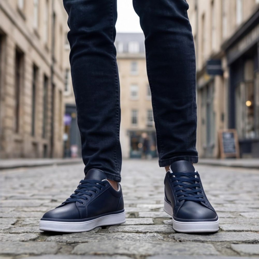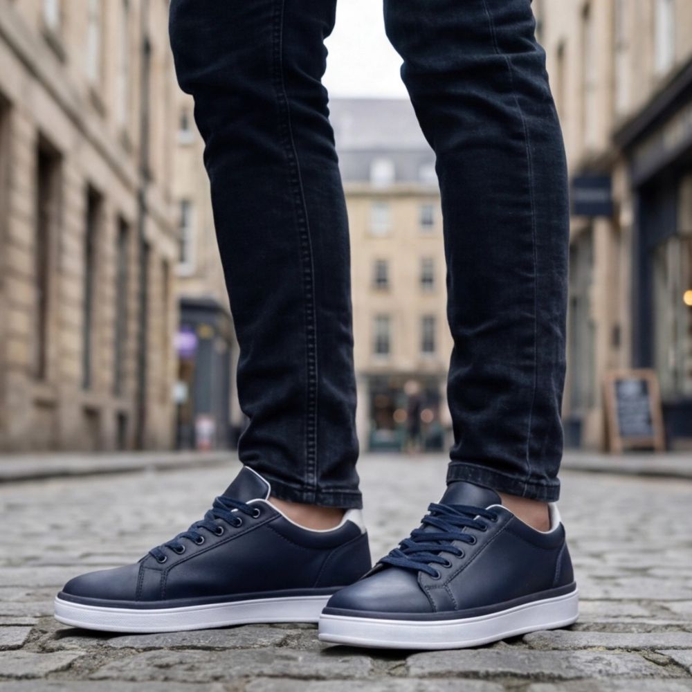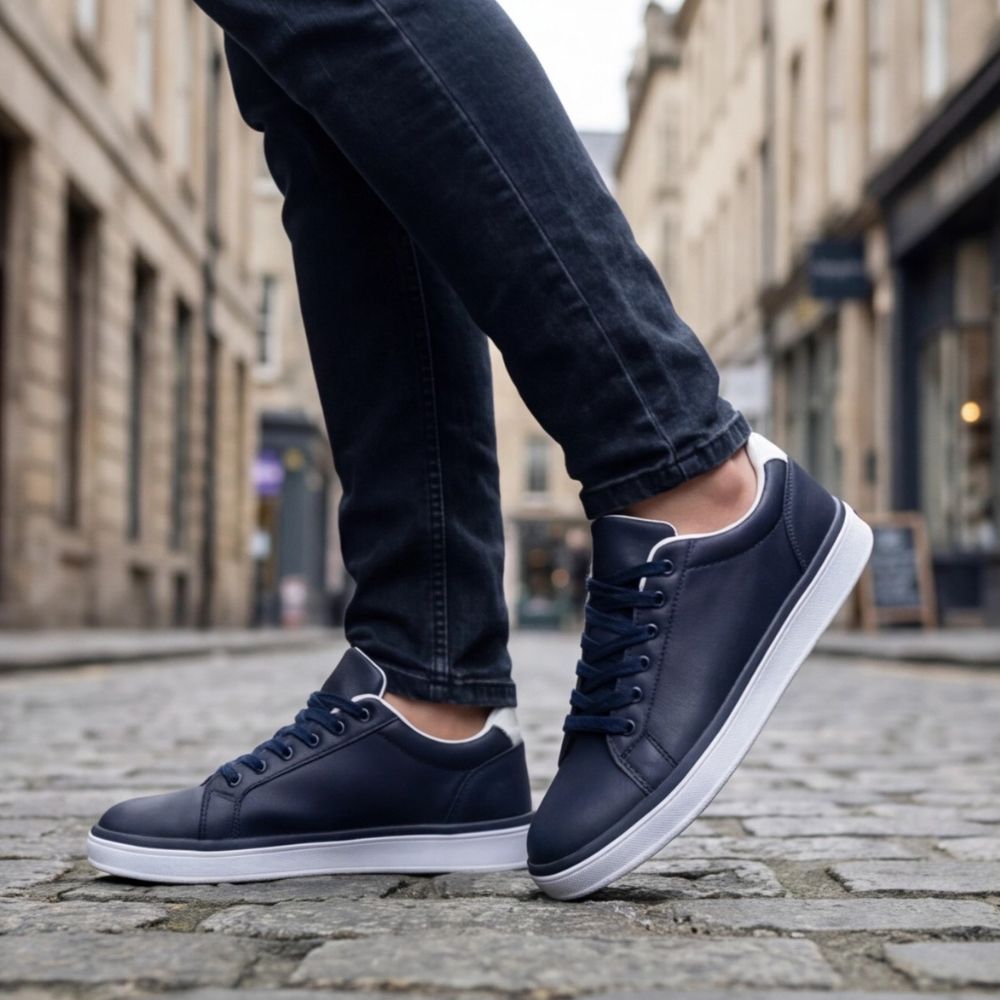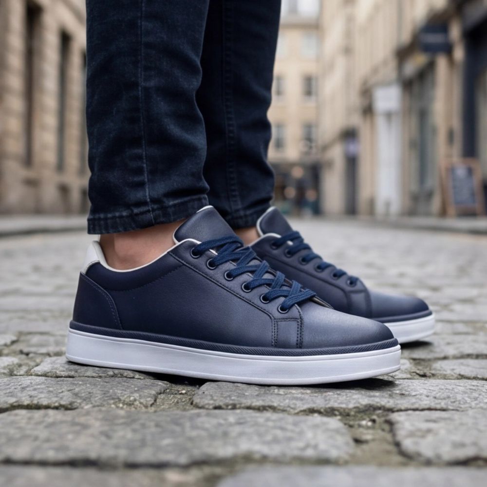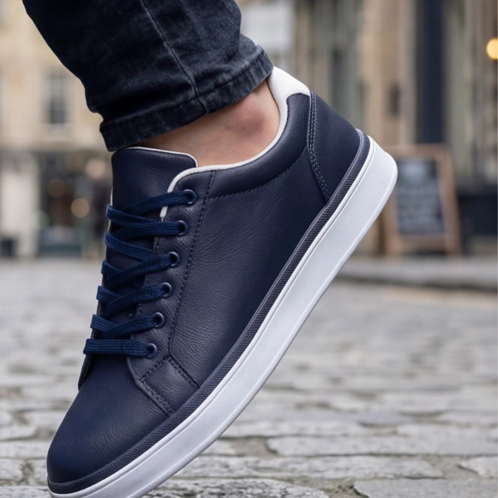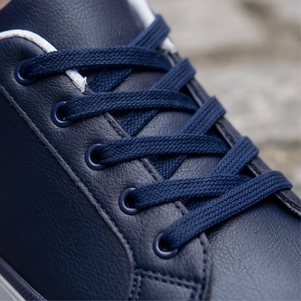 ✔ Boja: Duboka teget (Navy Blue) sa čistim belim detaljima na peti i đonu. ✔ Zatvaranje: Klasične teget pertle koje doprinose monohromatskom izgledu gornjišta. ✔ Materijal: Premium eko-koža sa blagom teksturom, izuzetno laka za održavanje. ✔ Đon: Tanji, ravan beli đon sa suptilnim reljefom na ivicama za moderan profil. ✔ Detalji: Kontrastni beli rub oko zgloba koji pruža dodatnu vizuelnu dubinu i udobnost.