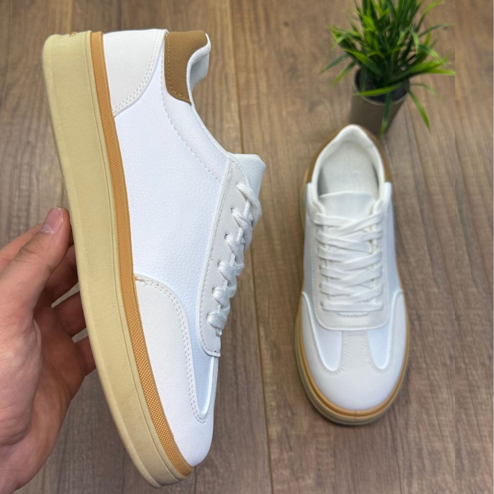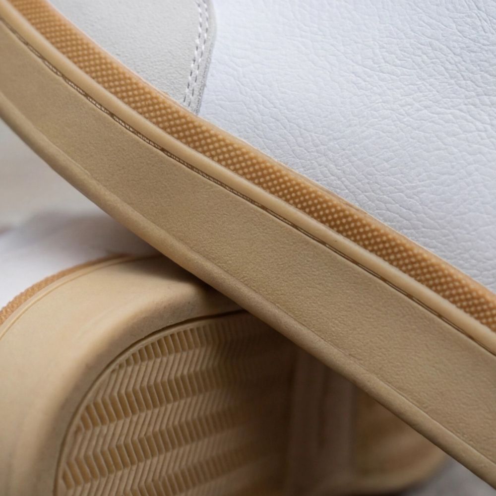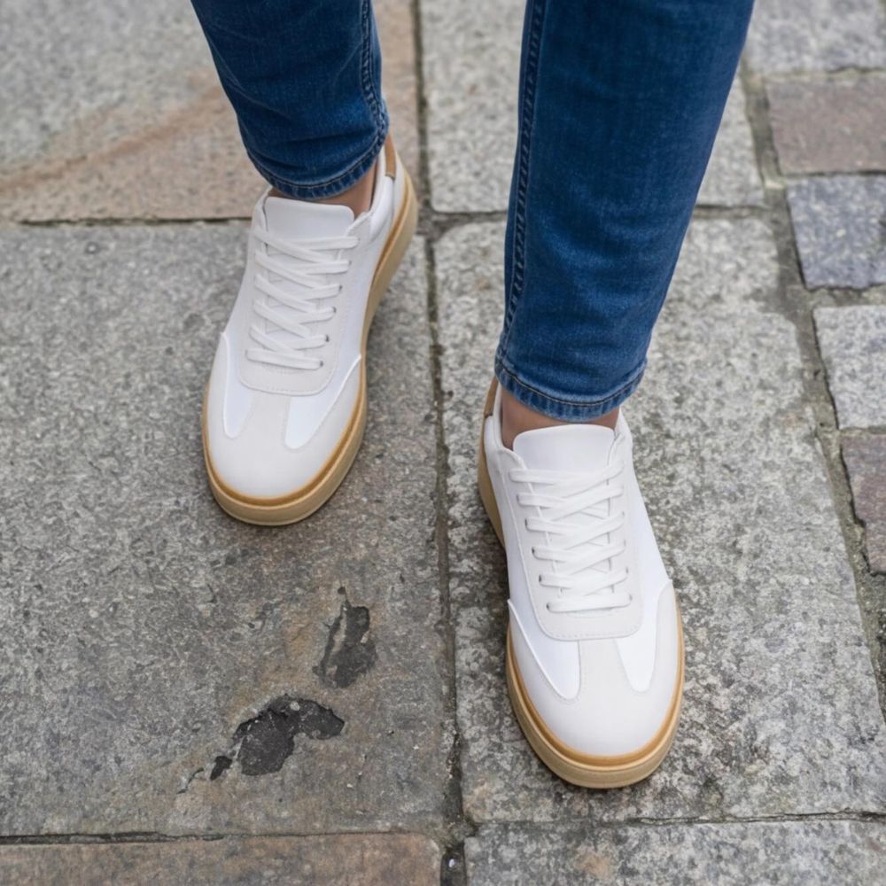 Gornjište je izrađeno od kombinacije glatke bele eko-kože i diskretnih teksturiranih panela na prednjem delu. Braon detalj na peti (heel tab) pruža suptilan vizuelni fokus, dok krem đon sa tankim gumenim slojem u boji kože (gum sole) zaokružuje ovu harmoničnu paletu boja.