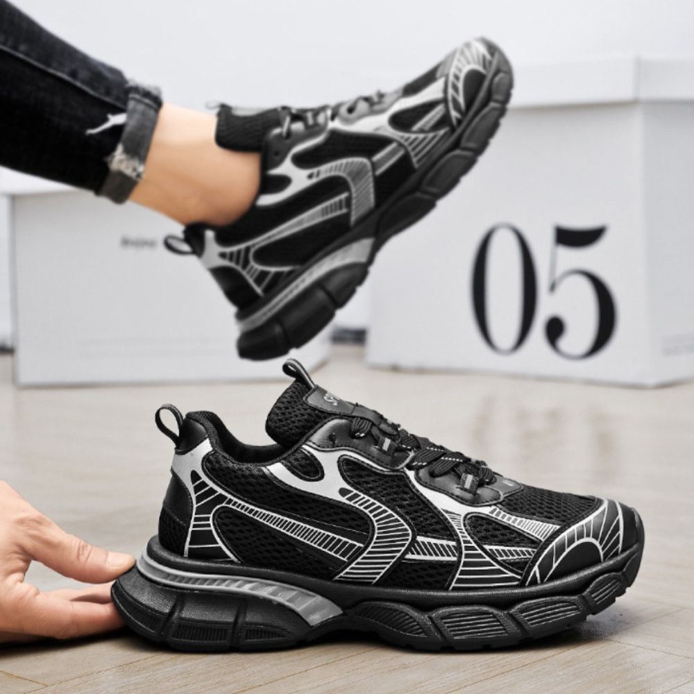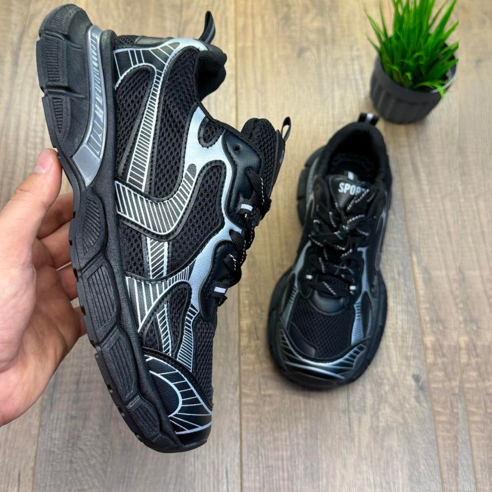Gornjište je izrađeno od višeslojne crne mrežice (mesh) koja osigurava maksimalnu prozračnost, dok sintetička ojačanja sa srebrnim linijama prate konture stopala pružajući stabilnost. Masivan, potpuno crni đon sa vidljivim teksturama i sjajnim panelima daje modelu upečatljiv „chunky“ profil koji je trenutno apsolutni trend.