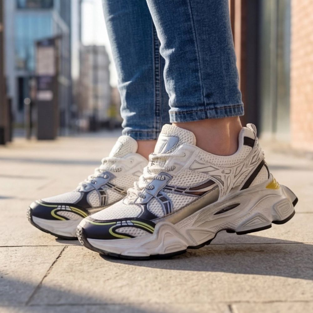 Gornjište je složene konstrukcije sa aerodinamičnim linijama koje se pretapaju u masivan, reljefni beli đon, pružajući modelu moćnu i stabilnu siluetu.