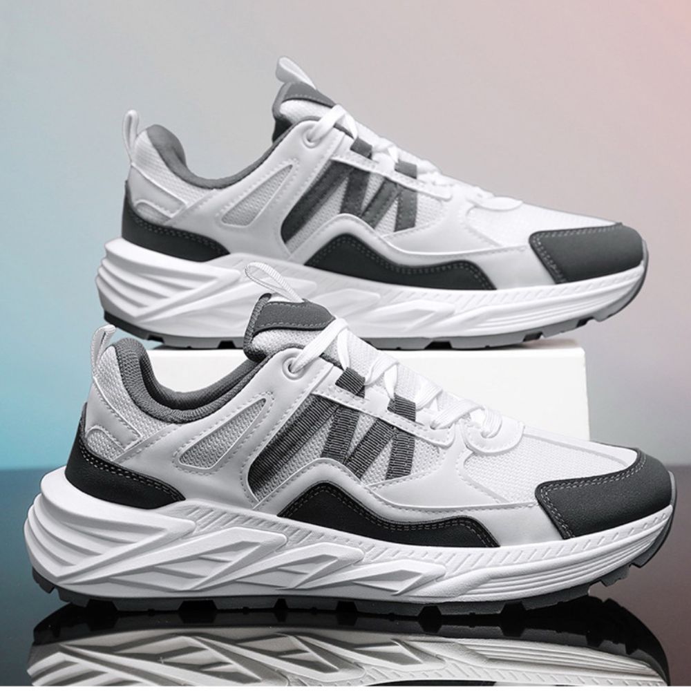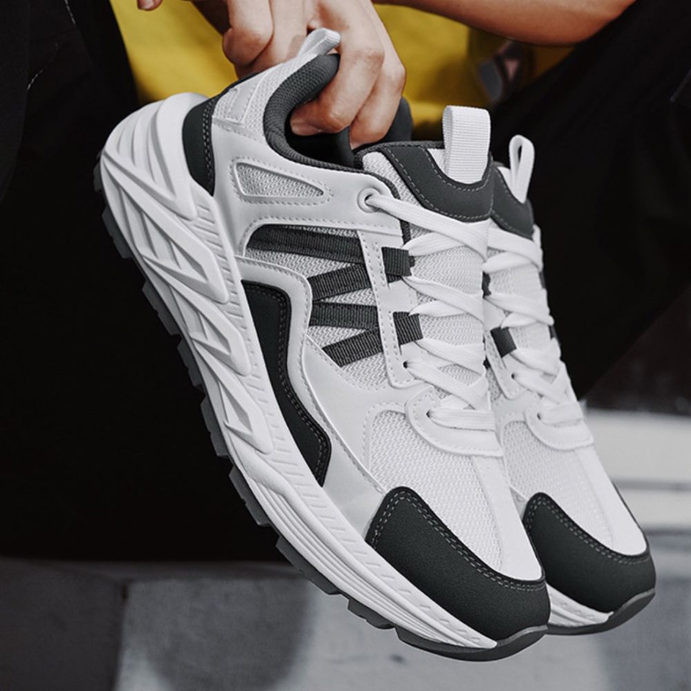 Gornjište je dizajnirano sa naglašenim prugastim motivima koji se prožimaju kroz mrežastu strukturu, dok izrazito reljefni beli đon sa oštrim geometrijskim linijama pruža snažan vizuelni uticaj i vrhunsku stabilnost.