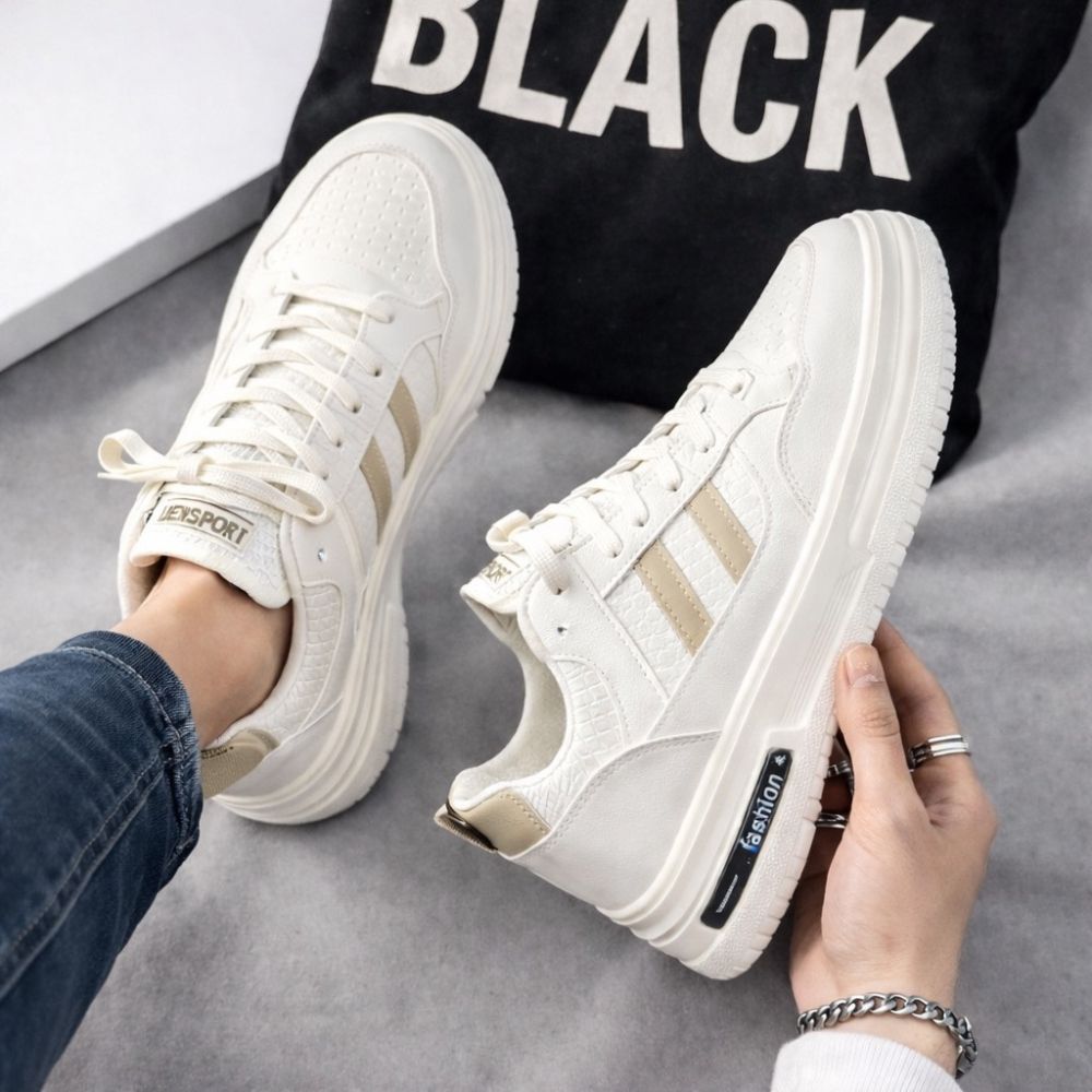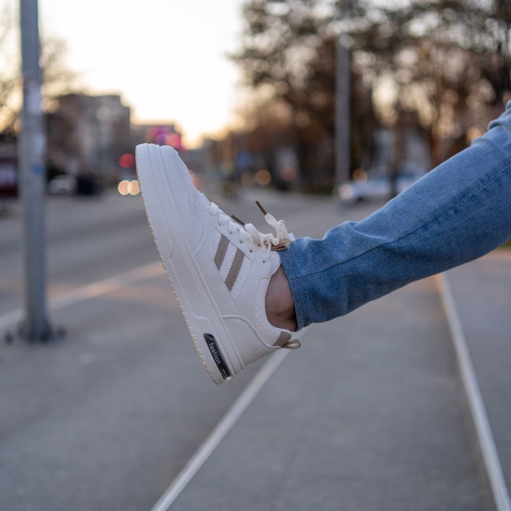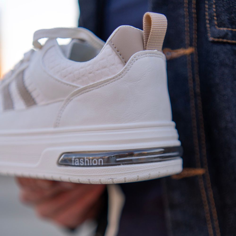 Gornji deo je izrađen od visokokvalitetne eko kože sa specifičnom reljefnom teksturom na prednjem delu i oko zgloba, što doprinosi luksuznom vizuelnom utisku. Bočne strane krase dve elegantne bež trake koje se savršeno nadopunjuju sa detaljem na peti, dok natpis „Fashion shoes 1987“ na jeziku naglašava retro-sportski karakter modela. Masivan beli đon sa crnim „Fashion“ detaljem u bočnom prozoru pruža modernu završnicu i garantuje udobnost.